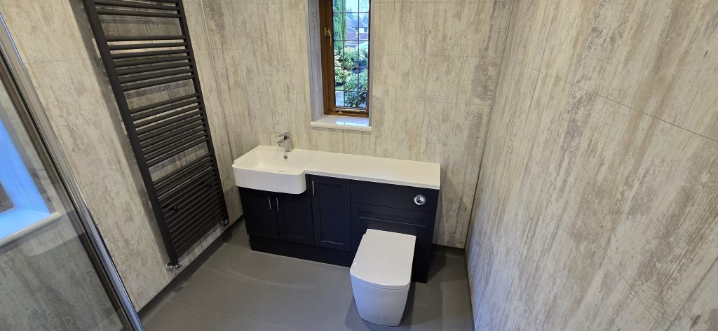 - Wall Tiles or Waterproof Wall Panels Choose from traditional tiles or modern waterproof panels (such as Fibo) for a cleaner, low-maintenance finish.
